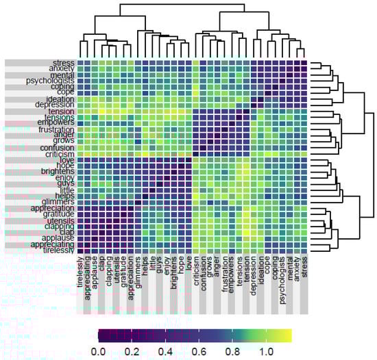 We used the superheat R package [65] to visualize the word vectors (obtained from Word2vec), highlighting contextual similarity. “The rows and columns are ordered based on a hierarchical clustering and are accompanied by dendrograms describing this hierarchical cluster structure” [65].