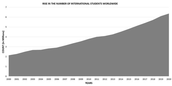 Furthermore, Ding [] cites the OECD’s report, which indicates that the number of students registered outside their country of citizenship has risen significantly from 2.1 million in 2000 to 4.3 million in 2011 and, most recently, to 6.3 million in 2020 (UIS Statistics, 2023) (refer to Figure 1, where data is only available until 2020). This represents an approximately 200% increase in international students from 2000 to 2020, suggesting that the trend of international student mobility will continue to proliferate in the coming years.