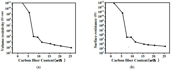 Electrical properties of LSR/CF with different CF concentrations. (a) Volume resistivity. (b) Surface resistance.