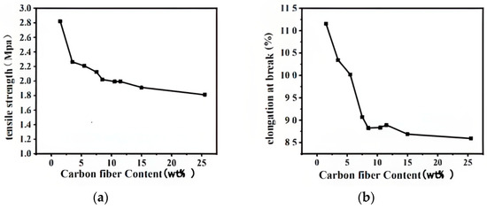 The figure shows that, as the CF concentration increases, the mechanical properties generally rapidly decline first and then slowly decline. Miiela et al. [21] found that adding too much carbon fiber would reduce the mechanical properties of composites. In this paper, when the carbon fiber content is 1.5 wt%, the tensile properties of conductive silicone rubber are the best, with tensile strength of 2.81 Mpa, elongation at break of 111.3%, and elastic modulus of 0.67 MPa. When the CF concentration was increased from 1.5 to 5.5 wt%, the mechanical properties of the conductive silicone rubber rapidly decreased, because part of the CF filler mixed with LSR to yield the conductive silicone rubber and another part precipitated to the lower layer of the mixed solution in the molding preparation stage to form a CF-like conductive film. The mechanical properties of LSR/CF improved when the CF content was increased from 5.5 to 7.5 wt%; the tensile strength exceeded 2 Mpa and the elastic modulus exceeded 0.4 MPa. X. Zhao et al. [22] found that in a certain range, with the increase of CF load, CF is not always surrounded by SR matrix, which makes the interaction between filler and matrix weak. Therefore, both tensile strength and elongation at break decrease. When the carbon fiber content exceeds 7.5 wt%, the mechanical properties tend to decrease rapidly. When the mass fraction of carbon fiber reaches 25.5 wt%, the tensile strength is 1.81 Mpa, the elongation at break is 85.9%, and the elastic modulus is 0.36 MPa. Compared with 7.5 wt% carbon fiber, the tensile strength, elastic modulus, and elongation at break of carbon fiber conductive silicone rubber decreased by 0.41 MPa and 0.02 Mpa, respectively, from 90.6% to 85.9%. Therefore, under the experimental conditions of a single carbon fiber-filled silicone rubber, the carbon fiber conductive silicone rubber with a mass ratio of 5.5–7.5 wt% has better mechanical properties. The tensile strength of spherical boron nitride 10/pitch-based carbon fiber 20/silicone rubber (s-BN10/PCF20/SR) prepared by reference [23] is 1.08 MPa, which is obviously lower than the tensile strength of 7.5 wt% carbon fiber conductive silicone rubber prepared in this paper (2.12 MPa), which indicates that the carbon fiber conductive silicone rubber prepared in this paper has good mechanical properties.