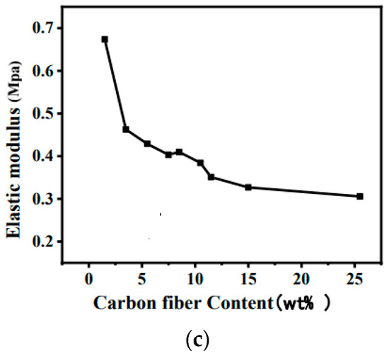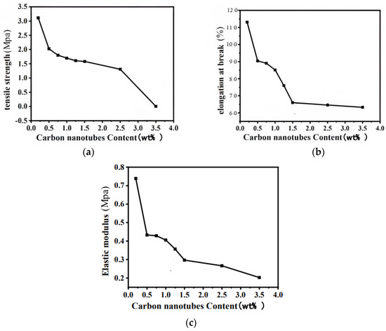 Mechanical properties of CF conductive silicone rubber with different concentrations. (a) Tensile strength; (b) elongation at break; (c) elastic modulus.