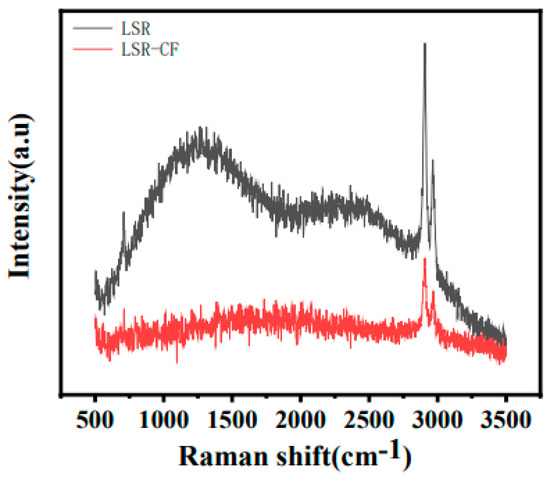 Figure 3 displays the Raman spectra of LSR/CF. In the figure, for pure LSR, the peak at 1340 cm−1 is ascribed to –CH2 bending and that at 2899 cm−1 is the characteristic peak of –CH2 stretching vibration. For LSR/CF, the bending and stretching vibration characteristic peaks of –CH2 were also observed at 1340 and 2899 cm−1, which proves that CF has good dispersion performance in conductive silicone rubber.