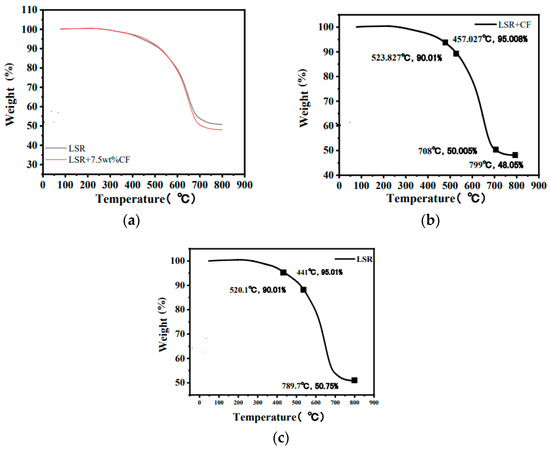 Thermogravimetric analysis of (a) LSR/LSR + 7.5 wt% CF; (b) LSR + 7.5 wt% CF; (c) pure LSR.
