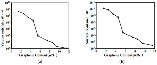 Electrical properties of graphene conductive silicone rubber with different concentrations. (a) Volume resistivity. (b) Surface resistance.