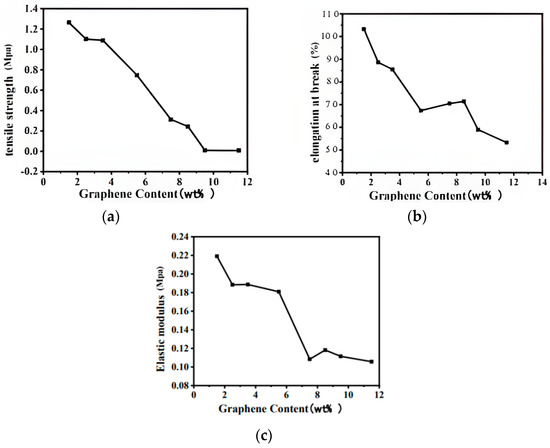 Mechanical properties of graphene with different concentrations. (a) Tensile strength; (b) elongation at break; (c) elastic modulus.