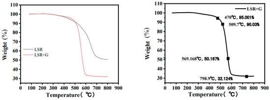 As shown in Figure 8, for LSR/G with 5.5 wt% graphene, Td.5%, Td.10%, and Td.50% were 470 °C, 509 °C, and 569 °C, respectively, and the corresponding temperature and weight loss at Tmax were 798 °C and 32.124%, respectively. Furthermore, according to the thermogravimetric analysis, the heat resistance of LSR/G was higher than that of pure LSR. The initial decomposition temperature of LSR/G was 29 °C higher than that of pure LSR (441 °C), and the heat resistance enhancement effect of the LSR/G was higher than that of LSR/CF.
