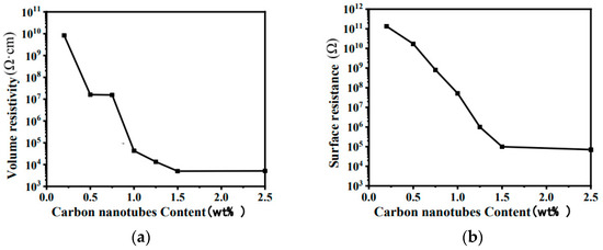 The volume resistivity and surface resistance curves of LSR/CF with different CF concentrations are shown in Figure 1 and Table 2.