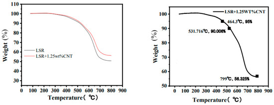 As shown in Figure 12, for CNT content of 1.25 wt%, Td.5% was 464.3 °C, Td.10% was 531.716 °C, and the corresponding temperature and weight loss at Tmax were 799 °C and 56.325%, respectively. Among the three studied carbon-based nano-conductive silicone rubber samples, LSR/CNT exhibited the best electrical properties, but its heat resistance reinforcement effect on silicone rubber was less than that of LSR/G and LSR/CF. A stable conductive network can be constructed when carbon nanotubes are filled with 1.25 wt%, and tensile sensitivity can be achieved even after bearing 500% tensile strain.