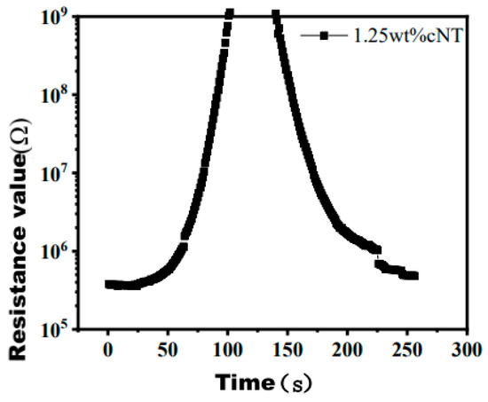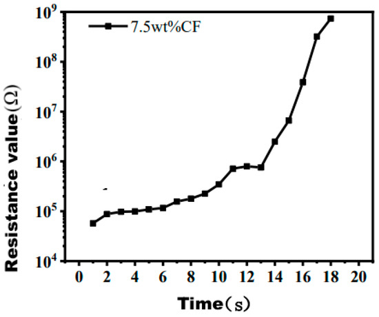 As shown in Figure 13, LSR/CNT/CF/G obviously has good tensile resistance characteristics. Its initial resistance was 2.69 × 103 Ω, and when the elongation was 100%, the resistance was 3.86 × 103 Ω. The resistance of LSR/CF with 7.5 wt% CF was 5.34 × 107 Ω, As shown in Figure 14,The resistance value of 5.5 wt% graphene conductive silicone rubber is 8.33 × 108 Ω. The stretching sensitivity of blended carbon nano conductive silicone rubber is better than that of carbon fiber conductive silicone rubber and graphene conductive silicone rubber. When the stretch rate reaches 250%, the resistance value 9.71 × 103Ω, As shown in Figure 15, 1.25 wt% carbon nanotube conductive silicone rubber resistance value is 7.09 × 106 Ω. As shown in Figure 16,The tensile sensitivity of LSR/CNT/CF/G was better than that of LSR/CNT, and the resistance value increased from 1.01 × 104 to 9.66 × 104 Ω when the tensile strength was increased from 250% to 520%. Blended carbon nano-conductive silicone rubber is in the range of 520–816%. The maximum resistance was 1.04 × 106 Ω when the elongation was 827%.