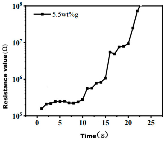 As shown in Figure 5, when the graphene filling amount was 1.5–4.5 wt%, under the condition of less graphene filling, no conductive path formed in the matrix, showing good insulation. When the graphene filling amount reaches 5.5 wt%, the volume resistivity is 8.72 × 104 Ω·cm, and the surface resistance is 2.48 × 106 Ω. The filling amount of graphene was moderate and the conductive particles were in contact with each other, which enabled the formation of conductive paths and greatly improved the conductivity. When the graphene content exceeded 5.5 wt%, the volume resistivity and surface resistance sharply decreased and the conductivity was unstable. The volume resistivity of boron nitride-multilayer graphene/silicone rubber (BN-MG/SR) prepared by the literature [24] is as high as 4 × 1011 Ω·cm, which is higher than that of the 5.5 wt% graphene conductive silicone rubber prepared in this paper. The ratio (8.7 × 104 Ω·cm) is 7 orders of magnitude higher, which shows that the graphene conductive silicone rubber prepared in this paper has better electrical properties.