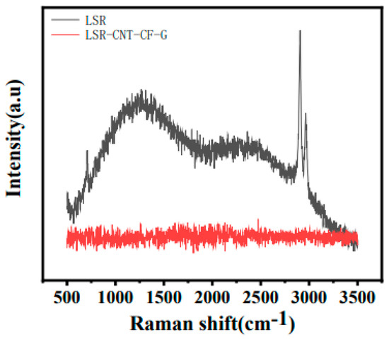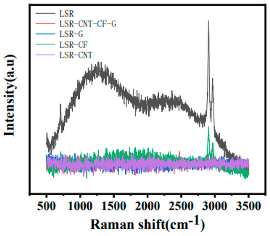 Next, the dispersion of LSR/CNT/CF/G was analyzed. Figure 17 displays the Raman spectra of LSR/CNT/CF/G in comparison to the spectra of the single-filler conductive silicone rubbers. For pure LSR, the peak of the bending of –CH2 was at 1340 cm−1, and the characteristic peak of the stretching vibration of –CH2 was at 2899 cm−1. The LSR/CNT/CF/G sample curve comprised two peaks: D (1280 cm−1) and G (2430 cm−1). The D peak stemmed from the defect of the sp3 orbital in the graphene sheet, while the G peak stemmed from the phonon mode of the sp2 carbon atom in the plane. As shown in Figure 18, for LSR/CF, the bending and stretching vibration characteristic peaks of –CH2 were still observed at 1340 and 2899 cm−1, respectively. The characteristic peaks in the curve of the pure LSR sample gradually weakened or disappeared, proving that good interfacial adhesion exists between the multi-filler blend and the matrix and that the dispersion is good.