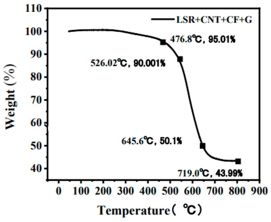When comparing the thermal stability of the carbon-based nano-conductive silicone rubbers prepared with different conductive fillers, the data need to be recorded under different weightlessness conditions. Then, the thermal stabilities of the different carbon-based nano-conductive silicone rubbers were compared. Figure 19 displays the thermogravimetric analysis diagram of LSR/CNT/CF/G. Figure 20 and Figure 21 compare the thermogravimetric analysis and derivative thermogravimetric results of the different carbon-based nano-conductive silicone rubbers and LSR, respectively.