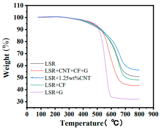 - Thermogravimetric analysis showed that the heat resistance of LSR/CNT/CF/G was better than that of LSR/CF, LSR/G, LSR/CNT, and pure LSR, and the initial decomposition temperature reached 476.8 °C.