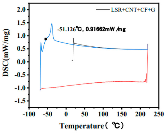 The Tg value is an important parameter for rubber materials; it affects the performance and service life of the materials. The internal motion of polymer materials can be divided into glassy, adhesive, high elastic, and viscous states. In general, the transition of polymer materials from glassy state to high elastic state is called as the glass transition, and its temperature is called the glass transition temperature. When the material temperature is lower than the Tg value, the material is brittle, and when the material temperature is higher than the Tg value [28], the material is highly elastic. Figure 22 displays the Tg of LSR/CNT/CF/G obtained using DSC, and Figure 23 compares it with that of the other four silicone rubbers.
