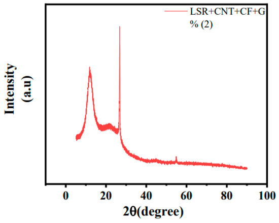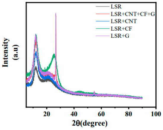 Figure 24 presents the XRD analysis of LSR/CNT/CF/G, and Figure 25 presents the XRD comparison analysis chart of the five kinds of silicone rubber. As shown in Figure 24, pure LSR exhibited two broad peaks in the center range of 2θ = 10° and 22.5°, which proves that the LSR polymer has an amorphous structure, and two broad peaks were also observed for LSR/CNT/CF/G in the center range of 2θ = 10° and 22.5°. Figure 25 shows that for LSR/CNT/CF/G, other than the above two characteristic peaks, the characteristic peak at 2θ = 24° was absent and that at 2θ = 28.2° was obviously diminished. This proves that due to the interaction of the conductive fillers, the fillers are uniformly dispersed during the ultrasonic dispersion and have strong interfacial force and the fillers are dispersed when the LSR solution is cured.
