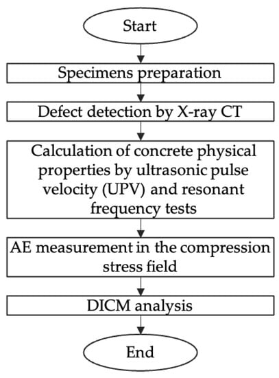 Based on DICM and AE technology, the fracture processes in concrete under uniaxial loading were investigated in this study. Damaged concrete was taken from the in-service irrigation structure affected by coupling severe environmental conditions, the defect of which was quantified by the X-ray CT method. The fundamental physical properties of the specimens were evaluated by measuring P-wave velocities and evaluating the dynamic modulus of elasticity using the resonance vibration method. Based on this result, only five samples have been selected for future investigation of pre-existing defect influence on strain distribution. The correlation between pre-existing defects and strain localization was revealed. The AE event allocation within the concrete matrix acquired by the AE source location analysis showed that the area near defects had a great concentration value. Moreover, the correspondence of amplitude and frequency of AE events to the defect location can evidence the magnitude and intensity of fracture in these points. The experimental flowchart is illustrated in Figure 1.
