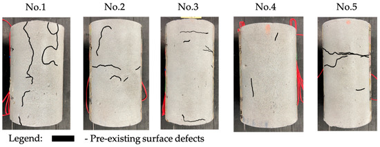 It is confirmed that the structure is damaged by the coupling effect of ASR and salt and frost deterioration mechanisms due to the long operation period and severe environmental conditions. Consequently, all samples tested have an initial damage degree in the form of internal discontinuities such as cracks and voids. Moreover, under visual investigation of samples, multiple flaws were detected on the surface after the coring test. It could be noted that, in this research, the term “pre-existing defect” is used to designate cracks or voids developed in a concrete structure during external factors affection such as environment and operation time. Figure 2 depicts the system of pre-existing defects detected visually.