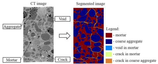The extraction of concrete components including aggregates, voids and cracks is conducted from CT images of the central longitudinal sample surface by the binarization techniques. The Otsu and Max Entropy threshold calculation methods are employed to segment the concrete particles and increase the accuracy of this process [27,28]. Additionally, some adjustments are introduced in this research such as the extraction of only coarse aggregates and the distinguishing between cracks and voids by the circularity parameter. Figure 3 illustrates CT and segmented images.