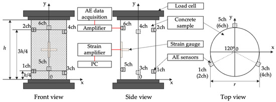 The use of six piezoelectric AE sensors allowed the detection of AE activity. The AE sensor was an R15 with a 150 kHz resonance frequency. Two strain gauges installed on the specimen surface were used to gather strain data in both axial and lateral directions. An AE measuring system (SAMOS made by PAC, New Jersey, US) was employed to extract the AE characteristics. All AE parameters were synchronized with the load values obtained from the compression testing machine. Table 2 demonstrates the AE test settings.