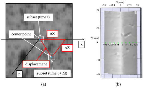 In this research, the strain distribution on the specimen surface was determined by DICM. It provides a non-destructive and non-contact method for measuring the object surface deformation under load. With this technique, it is possible to obtain a complete reconstruction of the defect geometry which is important for the analysis of cracking processes in concrete. DICM is based on digital image processing and numerical computation. Figure 5a demonstrates the subset-based DICM technique where a reference square subset with sufficient intensity variations is selected from the reference image taken from an un-deformed state. After using set parameters and a certain optimization algorithm, the image in a deformed state is searched for whose intensity pattern is of maximum similarity with the reference subset [38,39].