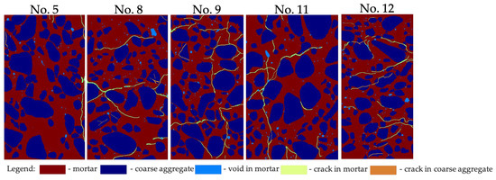 In accordance with color maps, each sample represents a heterogeneous structure with a unique allocation and orientation of coarse aggregates and voids within the concrete matrix. Samples No. 5 and No. 8 illustrate uneven coarse aggregate distribution density with big-size particles domination and gaps between them, whereas sample No. 9 shows the reverse tendency. To precisely assess the internal concrete structure, the corresponding components’ geometric properties were calculated (Table 4). The average area rate of coarse aggregate in the entire sample set is 44.15% with average area and circularity of 111.10 mm2 and 0.72, respectively. Void content consists of 0.78% on average, and the average area of the particle is 1.53 mm2 with a circularity parameter of 0.97.