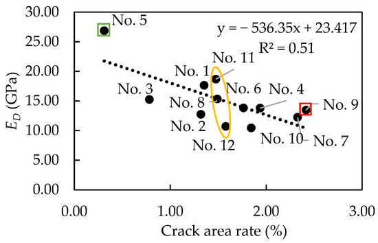 The physical properties of the samples are shown in Table 5. According to the NDT results, all samples can be characterized as damaged with an average pulse velocity of 1951 m/s which is twice lower than the pulse velocity in good-quality concrete (4000 m/s) [43]. The result of resonant frequency tests also shows a low value of the elastic parameter: the average frequency and corresponding ED value are 7587 Hz and 15.9 GPa, respectively. The obtained results are depicted in Figure 7. This figure demonstrates the correlation between accumulated cracking damage and ED (R2 = 0.51). All samples show various damage degrees under different physical properties: sample No. 5 has the highest ED (28.2 GPa) under low crack density (0.31%), whereas the internal structure of sample No. 9 demonstrates a high degree of cracking damage (2.42%) and poor value of dynamic modulus of elasticity (ED is 12.7 GPa), consequently. Both can be regarded as slightly and heavily damaged specimens. As for the rest of the samples, the dispersion of values is high, and they are placed in the middle part of the graph with a little shift to the left that demonstrates their damaged condition. Based on this result, we decided to conduct an evaluation of pre-existing defects’ influence on the strain distribution for five following samples: No. 5, No. 8, No. 9, No. 11 and No. 12. As can be seen, samples No. 8, No. 11 and No. 12 have about the same value of accumulated cracking damage (1.49%, 1.48% and 1.58%, respectively) but a different value of dynamic modulus of elasticity ED (14.9 GPa, 19.8 GPa and 11.6 GPa, respectively). To clearly understand this phenomenon, the compression test with AE measurement and strain localization will be conducted for these selected samples.
