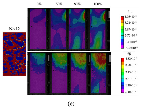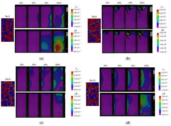 For sample No. 5 (Figure 9a), the strain in the x and z directions appeared to be a localization phenomenon at 50% of the strain energy level and the strain localization area concentrated along the center of the pre-existing flaw in the internal structure during the loading process. It indicates the main crack pattern which started from this location. The AE energy release at the strain energy level of 50% showed a sudden increase which means the significant crack development and the final failure corresponds to the high AE energy emission event near 100% of the strain energy level (Figure 8a). The localized displacement has also started from the 50% of strain energy level which is concentrated in the central part of the sample and moved to the bottom side implying the expansion of the radial surface caused by the pre-existing defects’ modifications. The strain exx and radial displacement dR of damaged and non-damaged areas illustrate the significant difference in the values from the crack occurrence event (40% of the strain energy level). In sample No. 11, the same strain distribution can be mentioned: the circumferential strain localizes near the internal defects forming the main fracture pattern (Figure 9d). However, here, strain started to localize before the high AE event occurred. AE energy release had a sudden skip near 40% of strain energy level that demonstrates that fracture processes evolved faster (Figure 8d).