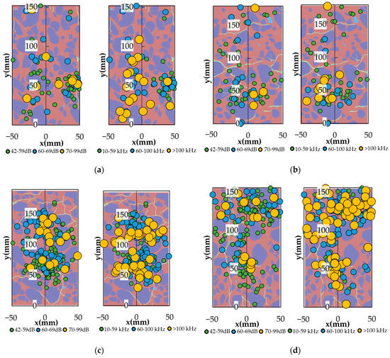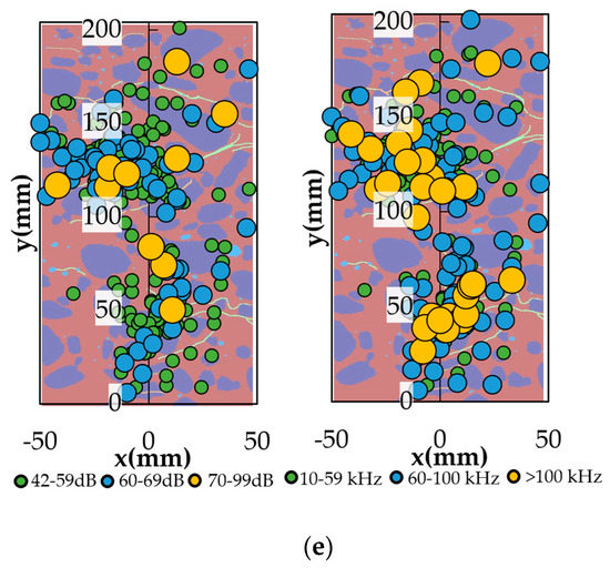 The background of each graph depicts the corresponding internal sample structure where pre-existing defects are clearly detected. The signal parameters were sorted by amplitude and peak frequency. In this research, the amplitude analysis was conducted for three bands: 42 to 59 dB, 60 to 69 dB and 70 to 99 dB. In peak frequency analysis, the signals were sorted out by 10 to 59 kHz, 60 to 99 kHz and 100 kHz and higher. The location of each AE event and its intensity are clearly observed. During the concrete deformation and fracture process, the AE frequency spectrum range was very wide. The distribution characteristics of frequency–amplitude greatly differed under various systems of pre-existing defects in the internal structure of the material. It is investigated that the amplitude value of low-frequency signals (10–59 kHz and 60–100 kHz) was bigger than that of high-frequency (bigger than 100 kHz). Usually, high-frequency waves are generated from small defects relating to the damage process beginning, whereas low-frequency ones can be produced only from large cracks developed during the final failure [44]. The dispersion of the signals in samples No. 5 and No. 8 is higher and distributed through sample height (Figure 10a,b). In sample No. 5 (Figure 10a), the concentration point is observed: AE signals of high amplitude (70–99 dB) are allocated near the strain concentration point and where a defect exists that is evidence of the crack initiation point. The high number of AE events of low frequency (10–59 kHz and 60–99 kHz) is also located at this point corresponding to the main crack initiation and propagation. In sample No. 8 (Figure 10b), the AE events of high magnitude and low frequency can be noticed in the upper side of the specimen caused by the popping out of the concrete piece. The main fracture occurred near the lower sample side where the AE event concentration was denser. In other samples, the AE event accumulation illustrates compact behavior with a higher degree of event quantity. There is no obvious event localization point; events of different amplitude and frequency bands are presented in each part of the samples. The presented internal structure of samples also shows an uneven allocation of pre-existing defects that influence AE behavior. From Figure 10, the main deformation parts can be distinguished as follows: the majority of AE events in sample No. 9 are distributed in the central part of the cylinder (Figure 10c), the upper and left side of the specimen (Figure 10d) and on both sides of the central part (Figure 10e). The AE event distribution pattern in these samples replies to the internal defect system contour: events are located in the upper part of sample No. 11 and move to the lower one by the left side where a longitudinal crack exists (Figure 10d). In Figure 9e, two main concentration clouds of AE events can be observed which also correspond to the major crack allocation positions. It can be mentioned that these samples have some portion of low-frequency high-amplitude AE signals. It can be related to the fact that the coalescence of many cracks under relatively high stresses can involve cracks with diverse smaller scales. It can indicate the fracture instability stage of concrete [45].
