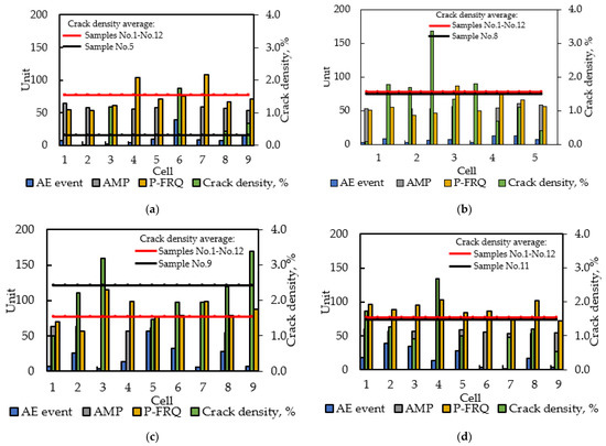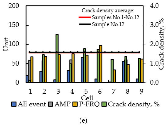To get a more comprehensive understanding of the signal source locations, we decided to apply an image-gridding method for establishing a relationship between defects and AE event characteristics. The binary images of cracks extracted were divided into a grid of smaller cells, and relative crack density was counted in each grid cell. The grid scheme is presented in Figure 11. In this research, the number of cells in each sample was equal to nine, and their size was the same varying in each sample in accordance with its dimensions. The same procedure was performed for the computation of AE event location and characteristics in each cell. Figure 12 depicts the observed dependence. The vertical axis represents the different units corresponding to each value on the horizontal axis such as the number of AE events, amplitude in dB and peak frequency in kHz. The average value of crack density for samples No. 1 to No. 12 and for an investigated sample is also presented on each graph as red and black lines, respectively.
