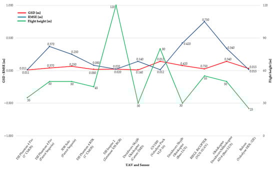 The graph shows the comparison of GSD, RMSE, and flight height for chosen sensors. The best results according to GSD were obtained when measured with the DJI Phantom 4 [58], DJI Phantom 4 PRO [61], and Droidworx Skyjib Oktokopter [63], where the GSD achieves an accuracy of less than 2 cm. On the other hand, according to RMSE, the best accuracy is achieved in measurements with the DJI Phantom 4 [58], DJI Inspire 2 [62], GV1300 [64], and Baloon [67], where the RMSE accuracy does not exceed 2 cm.