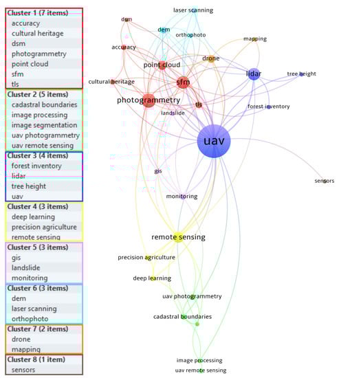 Separate keywords associated with the main keyword UAV formed the basis for the analysis of co-occurrence, which we present in a processed network of co-occurring high-frequency words. This search yielded a sample of 213 records. This part of the study is mainly focused on the co-occurrence method to analyze articles from various indexed journals obtained for 2013–2022. The most frequently occurring words express and identify the relationship between other conceptual sub-subjects with which they are associated. The open-source VOSviewer (https://www.vosviewer.com/, accessed on 1 January 2023) was used to analyze and visualize the obtained results. As a result, our literature review can save time for readers of this topic to quickly find and understand the content and orientation of the literature on the subject of UAVs in combination with several sensors, mainly in the field of spatial data collection.