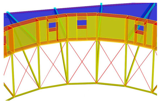Moreover, the nodes between the top beams and the vertical struts are connected to the bottom nodes of the adjacent beams belonging to the polygonal truss by means of diagonal ties, composed of steel bars 20 mm in diameter, which are represented in red in Figure 3.