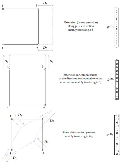 In the structural analysis, the floor behavior is fully described by the relationship between forces applied at vertex nodes and their displacements. For this reason, to adequately define the membrane elements’ properties, the equivalence between the solid FE model (3D model) and the 2D FE model (2D model) of the floor must be imposed in terms of the vertex nodes’ force–displacement relation.