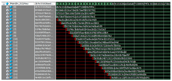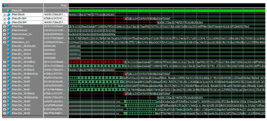 Figure 5 shows a series of AES-512 encryption and decryption simulations and results. The most obvious difference between AES-512 and AES-384 is that AES-512 performs more rounds, and Figure 6 shows the results of each round of the AES-512 key expansion.