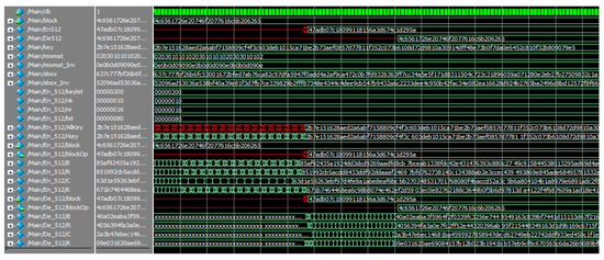 This section will show the AES-384 and AES-512 hardware description language [19,20,21,22] simulation process, mainly AES-384/512 for explanation, only with AES-384/512 attached to each process of the demonstration diagram [23,24,25], and not attached versions of AES-128, AES-192, or AES-384. The test content is “Learn to walk before you run”.