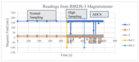 Different operation modes were provided as input to the Birds-3 FM (Flight Model) backup, and magnetometer readings inside the CubeSats were checked, the difference between the FM and the FM backup being that no solar cells were attached to the FM backup. Normal sampling (NS), high sampling (HS), and ADCS modes were executed. The normal-sampling mode was the nominal mode of the CubeSats. In high-sampling mode, the sensor data were collected every 5 s. The residual magnetic field after deducting the ambient magnetic field in the shield room was as follows: X: 16,570.8 nT (165.70 mG), Y: 1070.8 nT (10.70 mG), and Z: 2283.3 nT (22.83 mG).