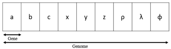 The nine unknowns to be found in this study were the three offsets of x, y, and z, gains of a, b, and c, and non-orthogonality angles of λ, ρ, and ϕ. The unknowns are shown in Figure 7. Definitions of the angles are shown in Figure 8 [14]. The unknowns were defined as chromosomes or genes, as shown in Figure 7. One gene was represented by 12 bits.