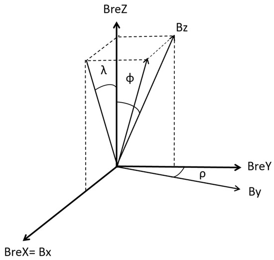 The genetic algorithm requires a fitness function to find the best match for unknowns. The difference between the observed magnetic field and the model magnetic field was defined as the fitness function. The non-orthogonality angles of ρ, λ, and ϕ are shown in Figure 8. BreX, BreY, and BreZ axes are considered perfect orthogonal axes taken as calibrated values in Equations (1)–(3). Bx, By, and Bz are the non-orthogonal axes of the magnetometer sensors considered as measured values in Equations (1)–(3). ρ is the angle from the nominal Y axis to the X–Y plane. λ and ϕ are the angles from the nominal Z-axis to the X–Z and Z–Y planes, respectively. Equations (1)–(3) show the relationship between the calibrated magnetic field in each axis, the measured values, gain, and offsets, and the non-orthogonal angles.