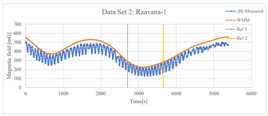 The results of the other two satellites’ (Uguisu and NepaliSat-1) magnetometer calibrations are shown below. First, the genetic algorithm was applied to the section of Data Set 2 shown between Ref 1 and Ref 2 in Figure 13, where the magnetic latitude is between −30.61 and 10.28 degrees for Uguisu. Next, the answers were applied to the whole of Data Set 3. The genetic algorithm was applied to the section shown in Figure 14, where the magnetic latitude is between 12.45 and −21.97 degrees for Nepalisat-1. Next, the answers were applied to Data Set 2.