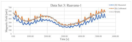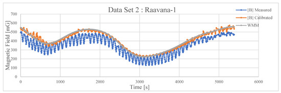 Using the parameters shown in Table 3, i.e., the parameters found from Data Set 2, we calibrated the magnetometer data of a whole orbit, named Data Set 3. Data Set 2 comprises data collected on 14 February 2021 by Raavana-1. Data Set 3 comprises data collected again on 11 April 2021 by Raavana-1. Figure 12 shows the calibration results obtained in this way. The calibrated magnetic field matches well with the WMM model. The overall error is 0.03, as shown in the fifth column of Table 4, which is as good as 0.02 (the fourth column) of the error for the original data of Data Set 2. We repeated similar steps using Data Set 3. The result is shown in Table 5. The calibration parameters were derived by applying the genetic algorithm to Data Set 3. Then, the parameters were used to calibrate the measurement data of Data Set 2. The overall errors (0.03 and 0.07 in the fourth and fifth columns of Table 5) are not as good as those in Table 4. Therefore, we use the parameters in Table 3 as the calibration parameters of magnetometers onboard Raavana-1.