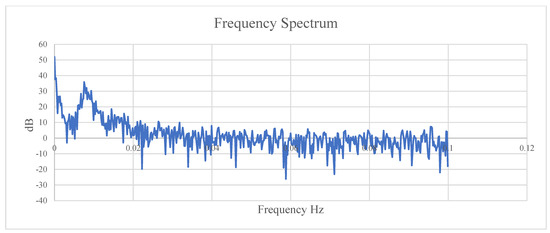 As we still observed high oscillations in the calibrated result, we attempted to use the frequency amplitude contained in the measured data to reduce the high oscillations. From Figure 15, we can see that the high-frequency oscillation is due to a combination of the satellite’s rotation and the mismatch of calibration parameters. From Figure 15, we determine the satellite rotates at about 0.005 Hz (1.8 deg/s). In Figure 16, we show the frequency spectrum of Data Set 1 of NepaliSat-1. It shows a peak at around 0.007 Hz. Instead of using the error defined in Equation (5) as the evaluation function of the GA, we used the sum of the magnitude of frequency amplitude and WMM data. The smaller the amplitude, the better the ranking is. In this search, we used the entire data sets of whole orbits rather than a selected region within low-latitude regions.
