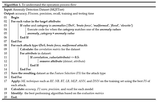 In the next stage, the correlation matrix is calculated for the dataset, and the attributes with weak or zero correlation are removed from the dataset. The resulting dataset is saved as the Feature Selection (FS) for the corresponding attack type. Then, the dataset is split into training and testing sets, and various machine learning techniques such as RF, NB, BT, LR, MLP, ANN, and DNN are applied on the training set using the best FS for each attack. Finally, the accuracy, F1score, precision, recall, training and testing time are calculated for each model, and the best performing algorithm is identified based on the evaluation metrics. The algorithm is designed to automate the process of detecting anomalies in a dataset, and it uses various techniques to identify the best performing algorithm. This algorithm can be applied to various datasets to detect anomalies, and it can be modified to include additional techniques or metrics to improve its performance. The algorithm is useful in detecting anomalies in various domains, including smart homes, finance, healthcare, and cybersecurity.