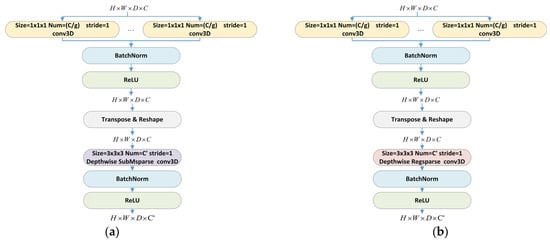 The architecture of the LW-Sconv module. (a) A lightweight sub-manifold sparse layer module (LW-Subsconv module). (b) A lightweight regular sparse layer module (LW-Regsconv module). represents the input size. represents the output size. Size represents the size of the convolution kernel. Num represents the number of convolution kernels.