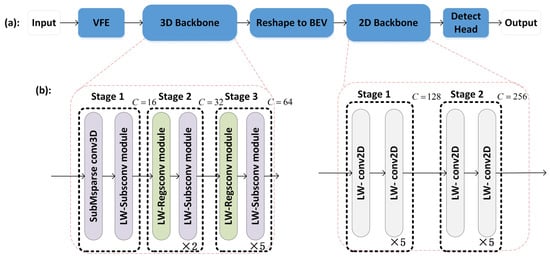 The overall framework of the algorithm in this paper is described in this section; the detailed network architecture is illustrated in Figure 2. Figure 2a shows the workflow of the algorithm. Firstly, the raw point cloud performs the voxelization to obtain voxels, which are used as the input of the network. The input voxels are encoded by voxel feature encoding (VFE) [28] to obtain voxel feature mapping. Then, the voxel features are sent to the 3D backbone. The extracted 3D features reshape to bird’s eye view (BEV) along the z-axis direction and are fed into the 2D backbone for further feature extraction. Finally, they are sent to the detect head to obtain the output of the network. The most important feature is the architecture of the backbone, which is shown in Figure 2b. The 3D backbone in the algorithm is composed of 11 LW-Sconv modules and the 2D backbone is composed of 12 lightweight convolution layer modules (LW-conv module). For the 2D backbone, the design idea of the lightweight convolution layer module is the same as that of the 3D, but the filter is 2D. For the 3D backbone, an LW-Sconv module is not directly applied at the beginning because the number of input channels is relatively small. Starting from the second layer, the LW-Subsconv module and the LW-Regsconv module are stacked. The first convolution layer module in the second and third stage uses stride = 2. Other hyperparameters remain unchanged in the same stage and the number of output channels in the next stage is doubled.