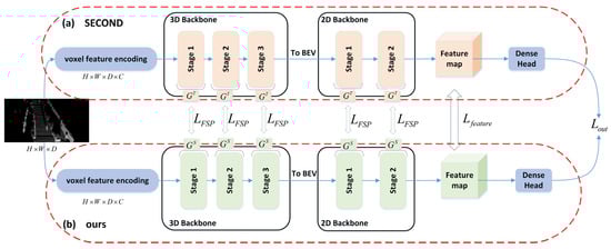 The overall training framework of the algorithm: (a) is the teacher model; (b) is the student model; represents the FSP matrix of the teacher model; represents the FSP matrix of the student model; represents the size of the raw point data; represents the size of the voxel feature.