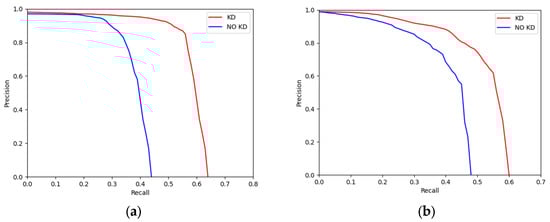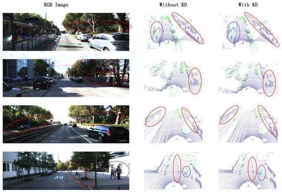 Figure 4 also provides the detailed prevision–recall (PR) curves for two datasets, showing the difference between the model after the lightweight model design with knowledge distillation and without knowledge distillation. It can be seen in the two ablation experiments that the loss function in this paper can effectively restore the accuracy of the lightweight model by using the three-part knowledge distillation losses to supervise and train the lightweight 3D point cloud object algorithm. It ensures that the lightweight model can meet the task requirements while reducing the complexity of the model.