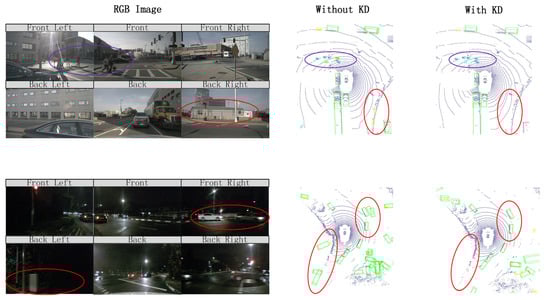 Qualitative results on the nuScences dataset. The figure shows the RGB image of the autonomous driving scene and the detection results of LW-SECOND-3 trained without and with knowledge distillation. The green box represents the car, the blue box represents the pedestrian, and the yellow box represents the cyclist. The circles mark the detection areas that are effectively enhanced using knowledge distillation.