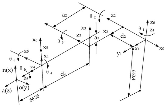Equation (4) describes the position and orientation of coordinate system {6} relative to the base coordinate system {0}, where and .