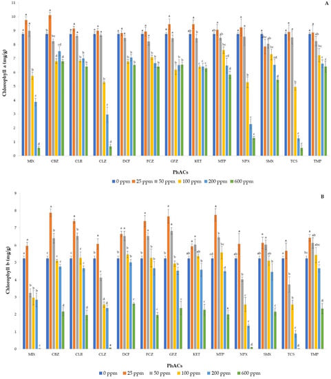 The worst results were recorded with the application of 600 ppb of MIX, CLZ, NPX, and TCS, which resulted in an almost zero concentration of both chlorophylls. In fact, the latter are pigments involved in photosynthesis and, therefore, responsible for plant growth, with CHA being more abundant because it is the principal pigment involved in photosynthesis, while CHB is an accessory pigment [45]. Changes in their concentration are indicative of the cumulative impact of environmental stress [46] and mainly attributed to metabolic disorders or ROS accumulation in chloroplasts [47]. Therefore, all contaminants tested, at doses higher than 50 ppb, induced a stress condition in basil seedlings as the reduction in chlorophyll content is a typical stress response [48]. Similarly, Opriș et al. [49] tested the effects of non-steroidal anti-inflammatory drugs (NSAIDs) on green leafy vegetables and found a reduction in chlorophylls, carotenoids, polyphenols, and flavonoids as a function of the dose applied. Wang et al. [50] also confirmed the toxicity of NSAIDs in green alga with a reduction in the concentration of photosynthetic pigments.