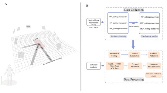 Soccer [1], basketball [2], and rugby [3] players are required to execute repetitive bouts of low and high-intensity physical activities. Furthermore, to achieve their competitive goals and meet the tactical requirements of their respective sports, players must perform specialized actions [4]. Typically, players are often required to cover a cumulative distance of 3 km, or even 5 km or more, involving constant changes of directions [2,5,6]. This rapidly changing direction of movements requires players to be well-coordinated and well-conditioned [7]. Interval running (IR) methods are a good training method to mimic game-specific loads during training, thereby developing the players’ ability to withstand fatigue and improving the skills needed for rapid changes in direction. The low and high-intensities, with high-frequency switching exercises, increase the likelihood of non-contact sports injuries [8,9,10]. Many researchers have focused on injuries of the knee joint in athletes, specifically the anterior cruciate ligament (ACL) [11,12], to study the mechanisms and biomechanical characteristics of overuse injuries. Renstrom et al.’s study revealed that the majority of ACL injuries in team sports were non-contact in nature [13]. Sugimoto et al. [14], supported this finding and reported an increased risk of ACL injury among fatigued athletes who changed their playing field position. A few conclusive studies found that alternating low- and high-intensity exercise lead to the ACL injury [15]. Young female athletes (professional and recreational) were subjected to 4–6 times higher risk of ACL injuries than their male counterparts when performing high-intensity activities such as jumping and side-cutting [16]. Although there are more studies on ACL injury in females than males [14], it is important to examine knee joint function in male athletes as well since the injury risk is likely to be not very different.